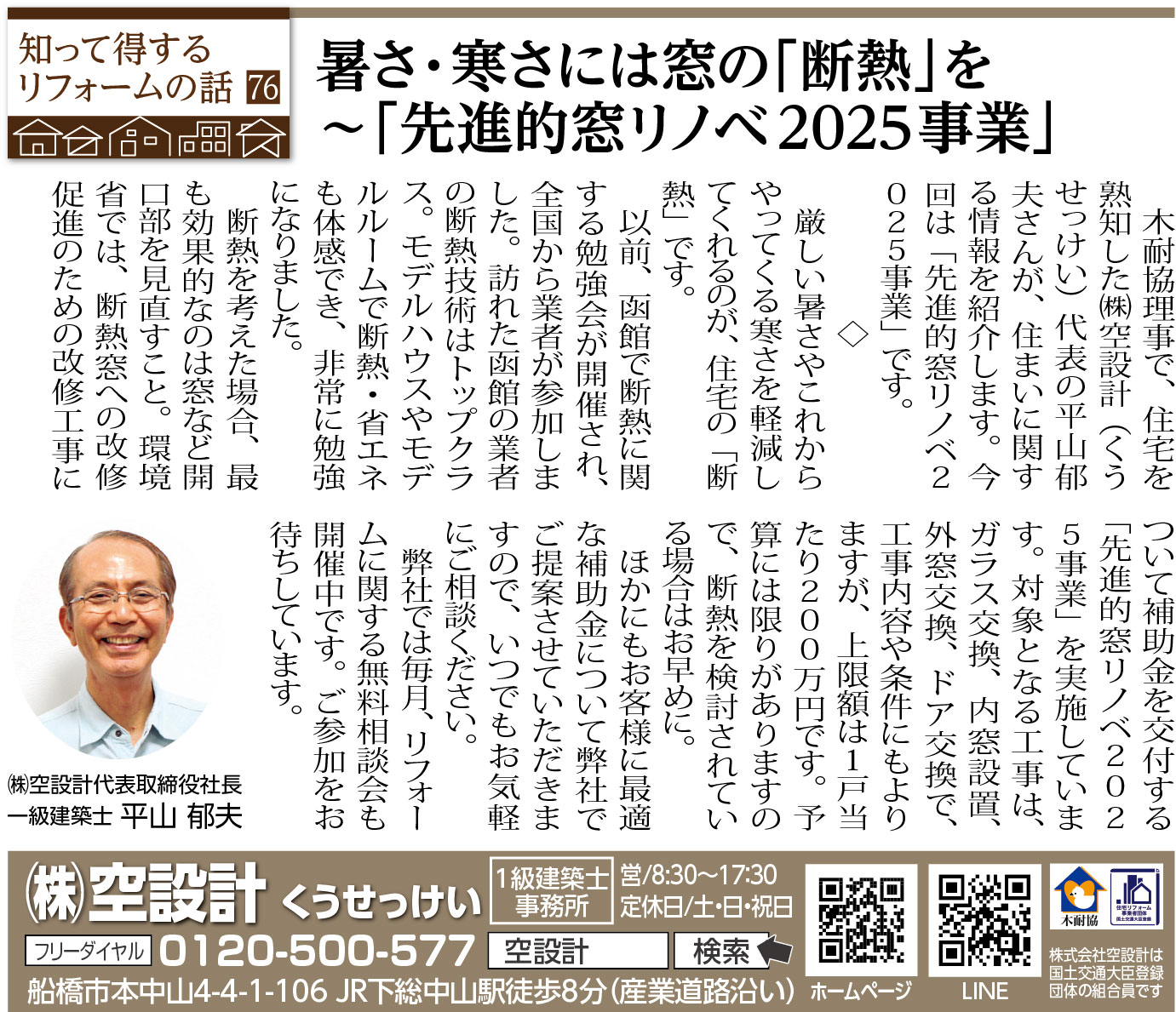 ホーム スタッフブログ 前の記事 一覧 次の記事 76 暑さ・寒さには窓の「断熱」を~「先進的窓リノベ2025事業」 2026/01/26(月) いちかわ新聞連載コラム 前の記事 一覧 次の記事 1ページ (全8ページ中) 1 2 3 4 5 6