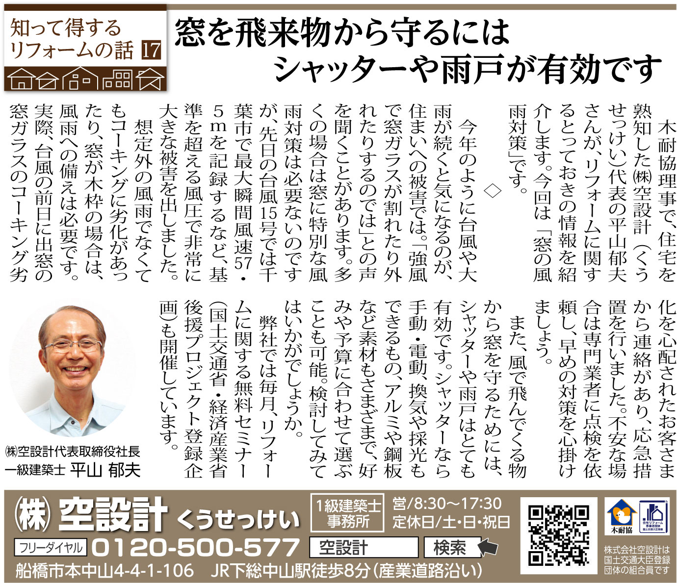 ホーム スタッフブログ 前の記事 一覧 次の記事 17 窓を飛来物から守るにはシャッターや雨戸が有効です 2023/08/14(月) いちかわ新聞連載コラム 前の記事 一覧 次の記事 1ページ (全6ページ中) 1 2 3 4 5 6