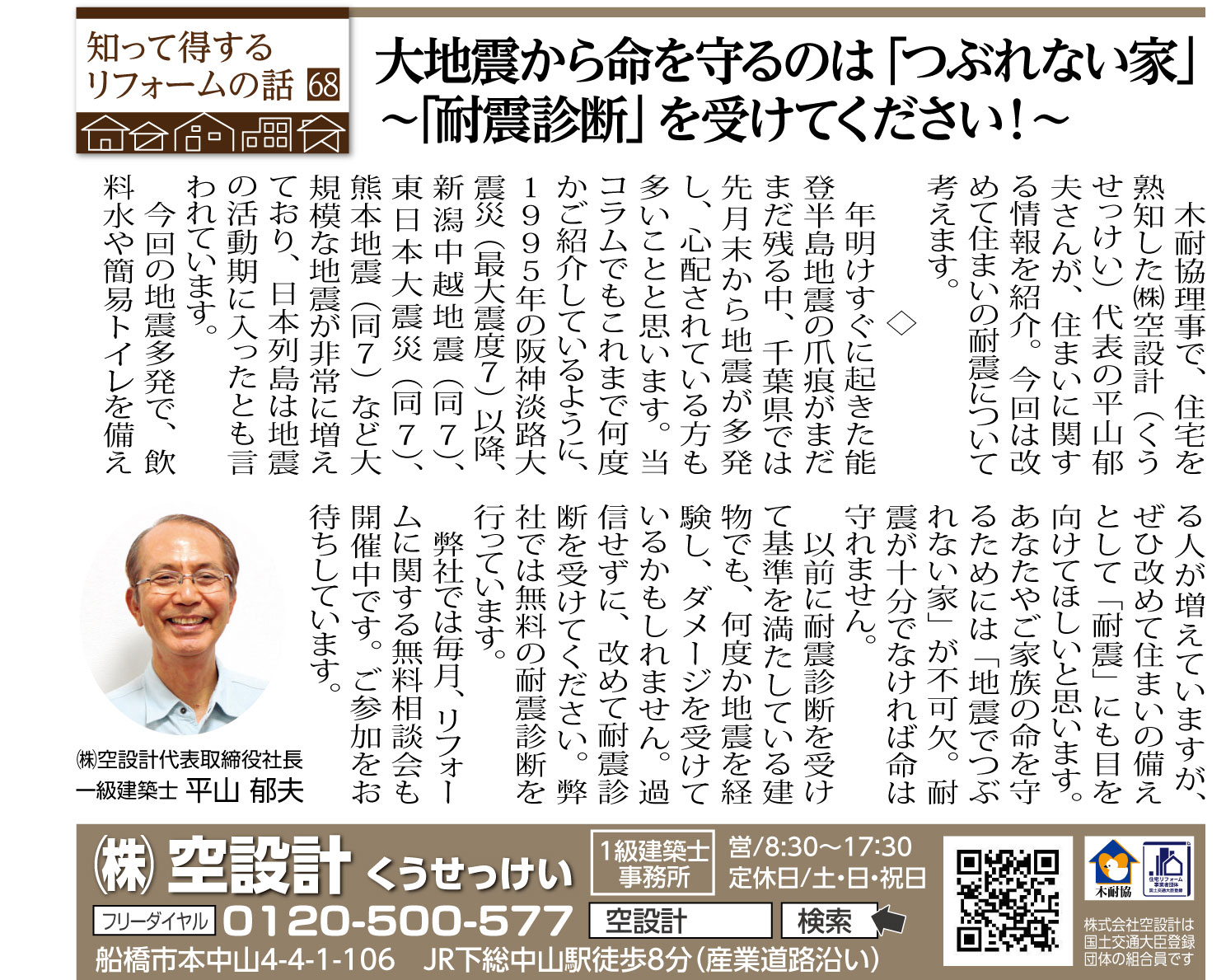 ホーム スタッフブログ 前の記事 一覧 次の記事 68 大地震から命を守るのは「つぶれない家」~「耐震診断」を受けてください! 2024/03/01(金) いちかわ新聞連載コラム 前の記事 一覧 次の記事 1ページ (全8ページ中) 1 2 3 4 5 6