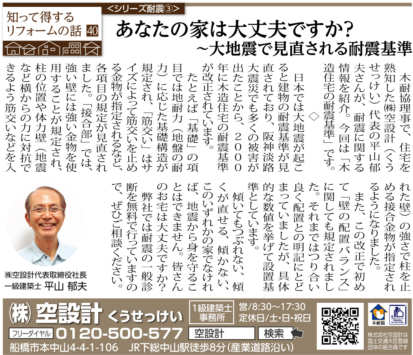 ホーム スタッフブログ 前の記事 一覧 次の記事 40 <シリーズ耐震③>あなたの家は大丈夫ですか?~大地震で見直される耐震基準 2023/08/18(金) いちかわ新聞連載コラム 前の記事 一覧 次の記事 1ページ (全6ページ中) 1 2 3 4 5 6
