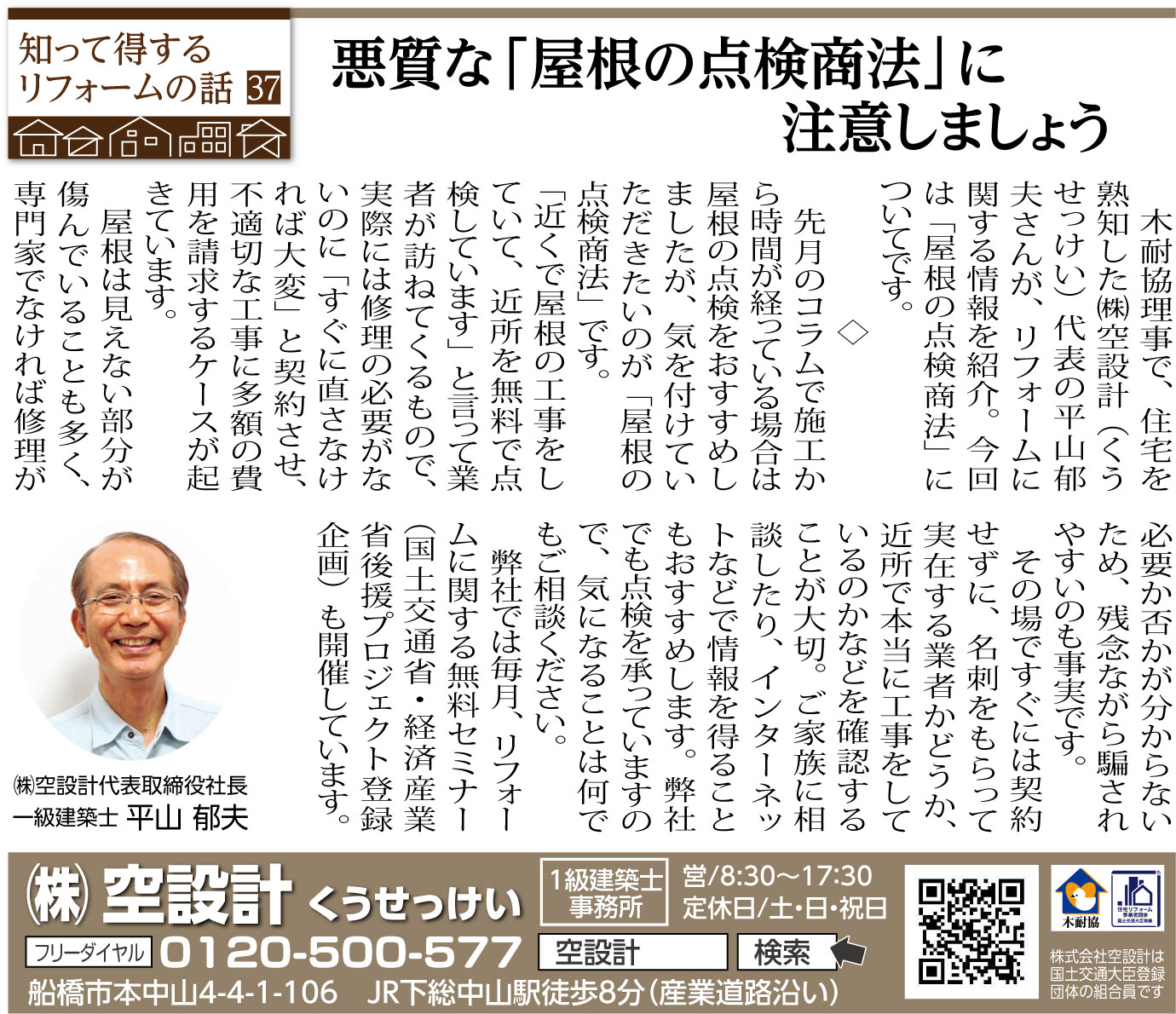 ホーム スタッフブログ 前の記事 一覧 次の記事 37 悪質な「屋根の点検商法」に注意しましょう 2023/08/18(金) いちかわ新聞連載コラム 前の記事 一覧 次の記事 1ページ (全6ページ中) 1 2 3 4 5 6