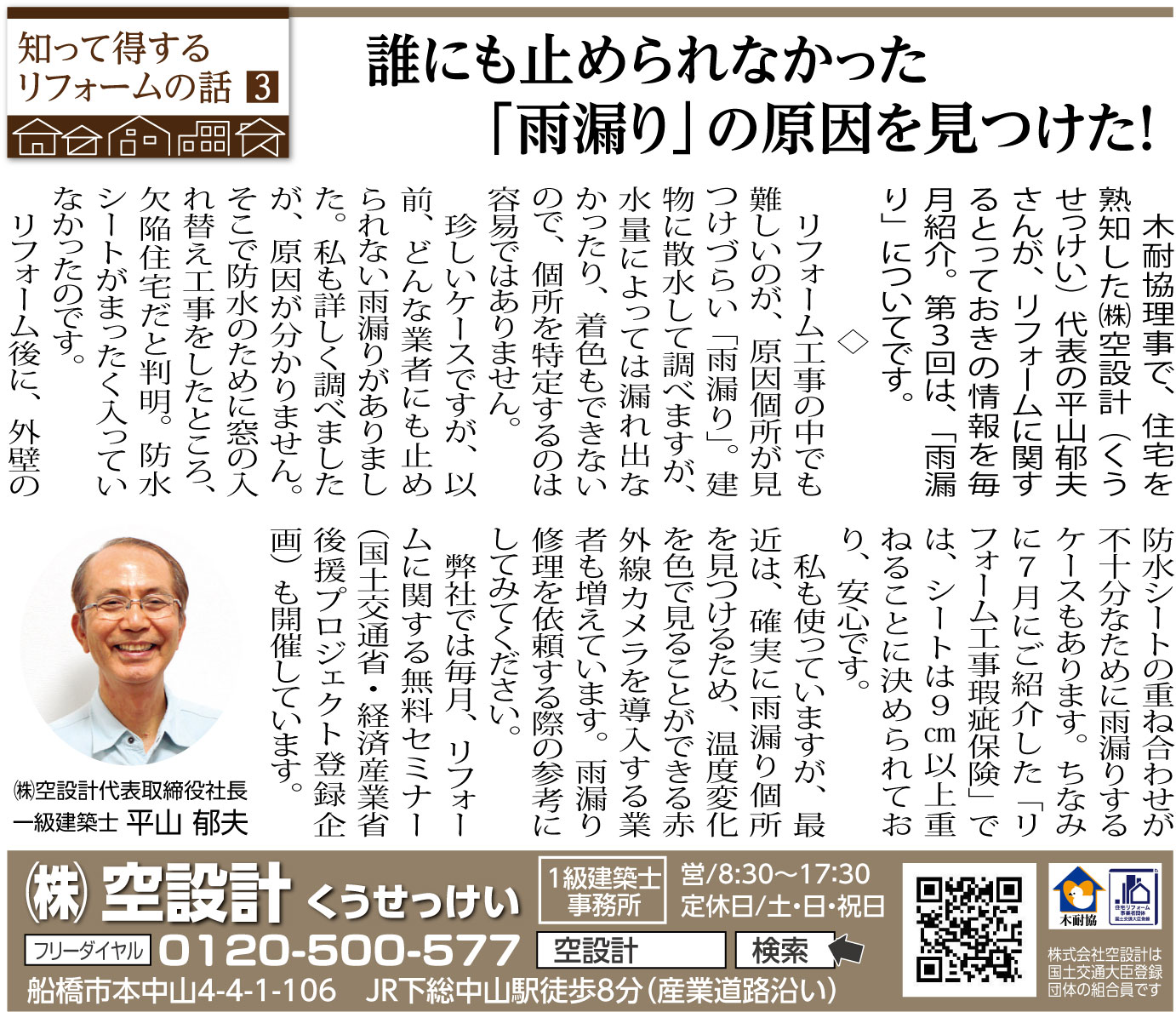 ホーム スタッフブログ いちかわ新聞連載コラム 前の記事 一覧 次の記事 03 誰にも止められなかった「雨漏り」の原因を見つけた! 2023/08/03(木) いちかわ新聞連載コラム 前の記事 一覧 次の記事 8ページ (全8ページ中) 3 4 5 6 7 8