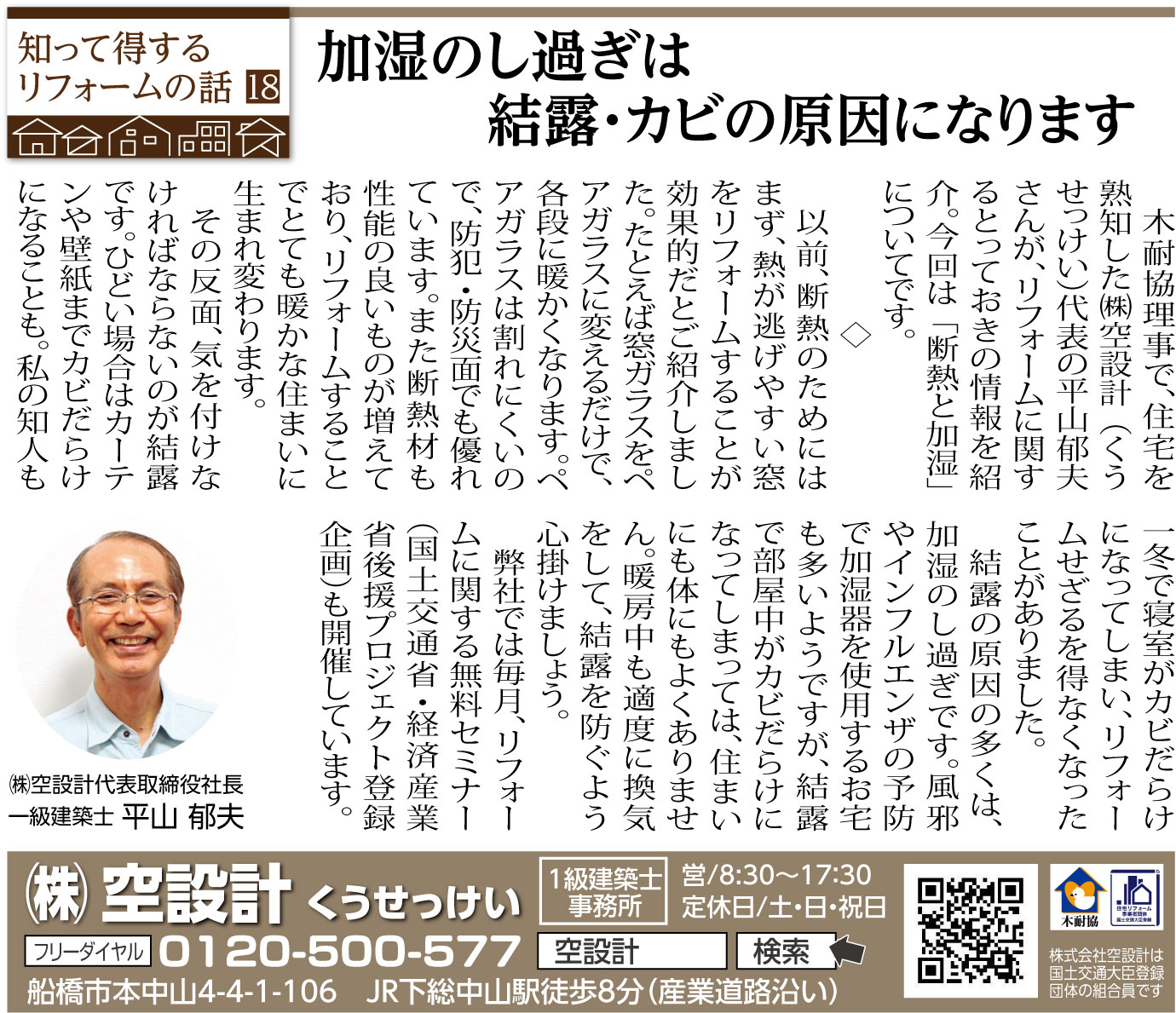 ホーム スタッフブログ 前の記事 一覧 次の記事 18 加湿のし過ぎは結露・カビの原因になります 2023/08/15(火) いちかわ新聞連載コラム 前の記事 一覧 次の記事 1ページ (全6ページ中) 1 2 3 4 5 6