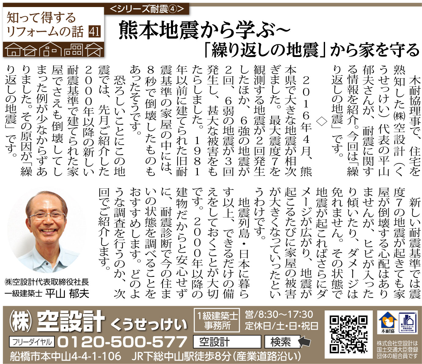 ホーム スタッフブログ 前の記事 一覧 次の記事 41 <シリーズ耐震④>熊本地震から学ぶ~「繰り返しの地震」から家を守る 2023/08/19(土) いちかわ新聞連載コラム 前の記事 一覧 次の記事 1ページ (全6ページ中) 1 2 3 4 5 6