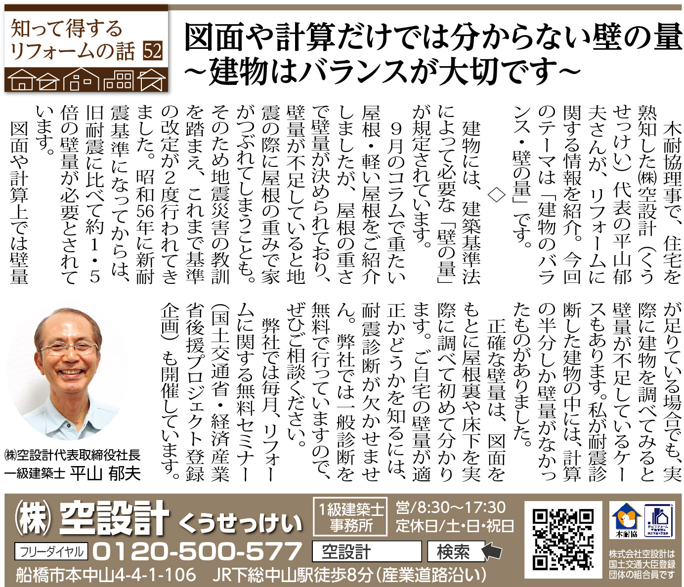ホーム スタッフブログ 前の記事 一覧 次の記事 52 図面や計算だけではわからない壁の量~建物はバランスが大切です~ 2023/08/25(金) いちかわ新聞連載コラム 前の記事 一覧 次の記事 1ページ (全6ページ中) 1 2 3 4 5 6