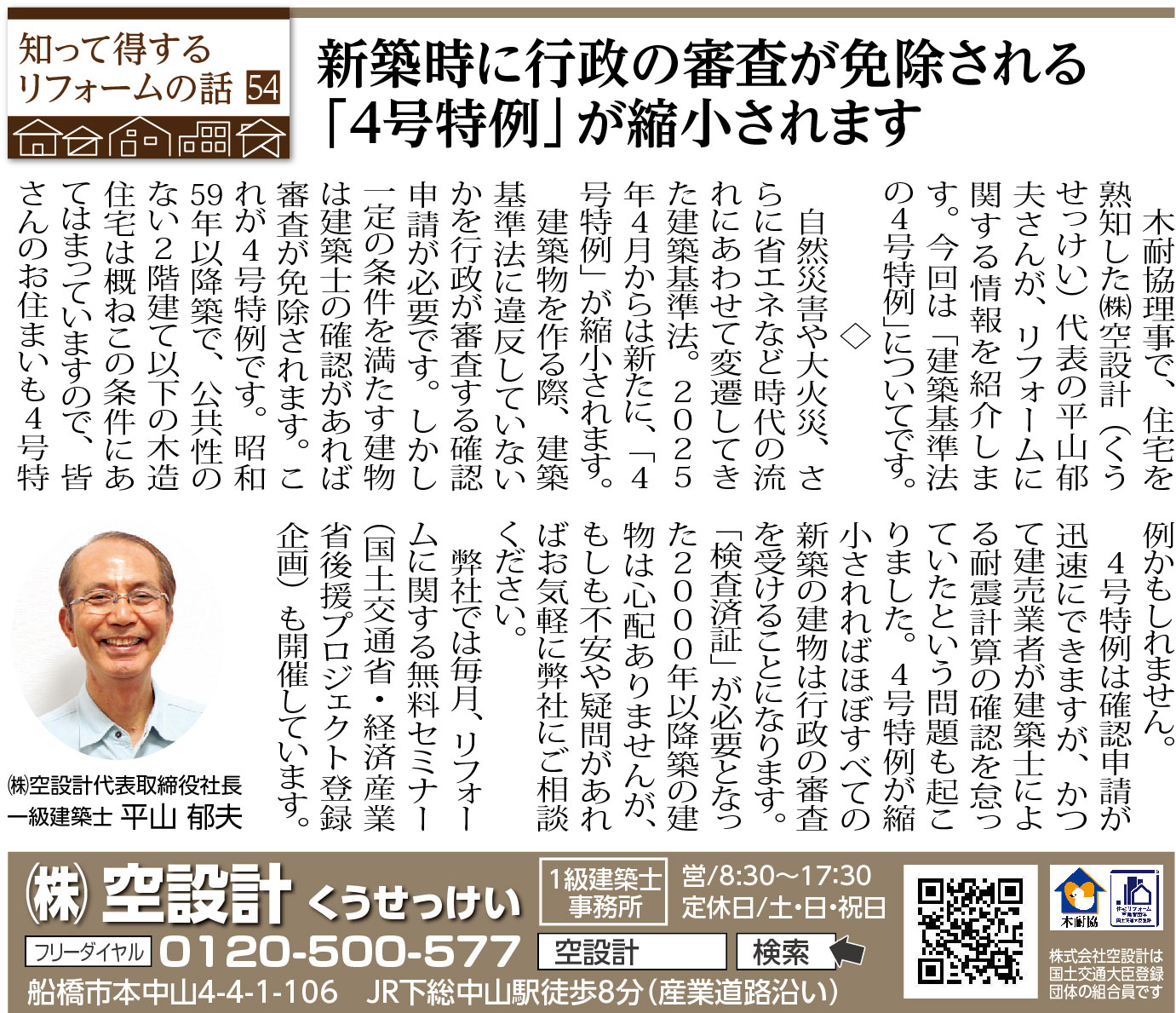 ホーム スタッフブログ 前の記事 一覧 次の記事 54 新築時に行政の審査が免除される「4号特例」が縮小されます 2023/08/27(日) いちかわ新聞連載コラム 前の記事 一覧 次の記事 1ページ (全6ページ中) 1 2 3 4 5 6
