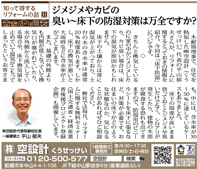 ホーム スタッフブログ 前の記事 一覧 次の記事 31 ジメジメやカビの臭い~床下の防湿対策は万全ですか? 2023/08/17(木) いちかわ新聞連載コラム 前の記事 一覧 次の記事 1ページ (全6ページ中) 1 2 3 4 5 6